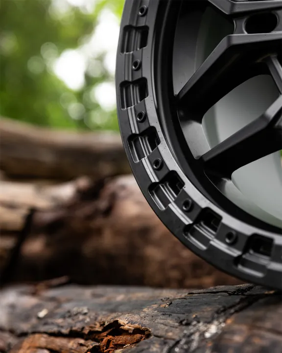 Axe is a stylish design with a unique split twin-spoke configuration enhanced by a detailed beadlock-style matt black lip with bolts.